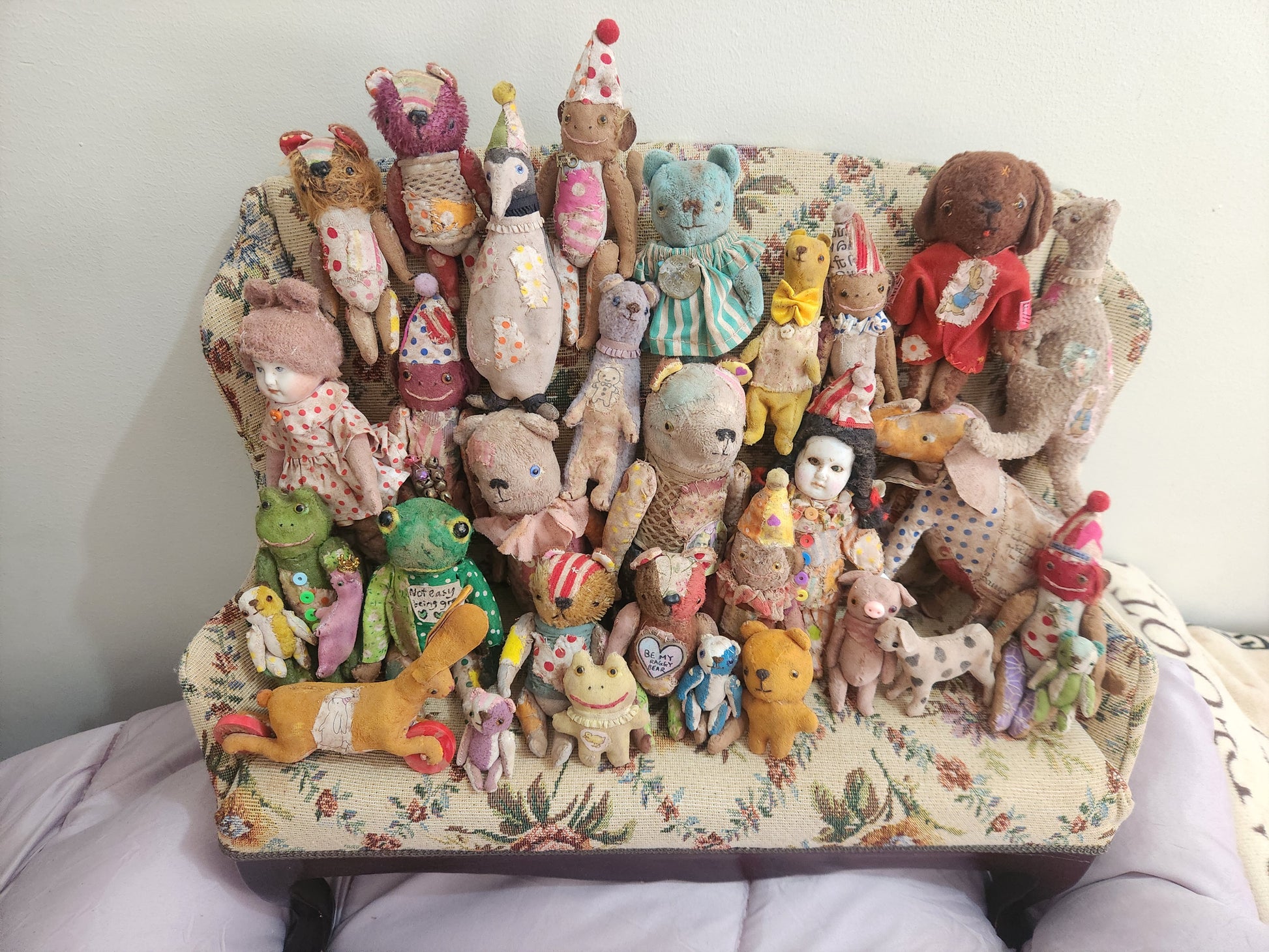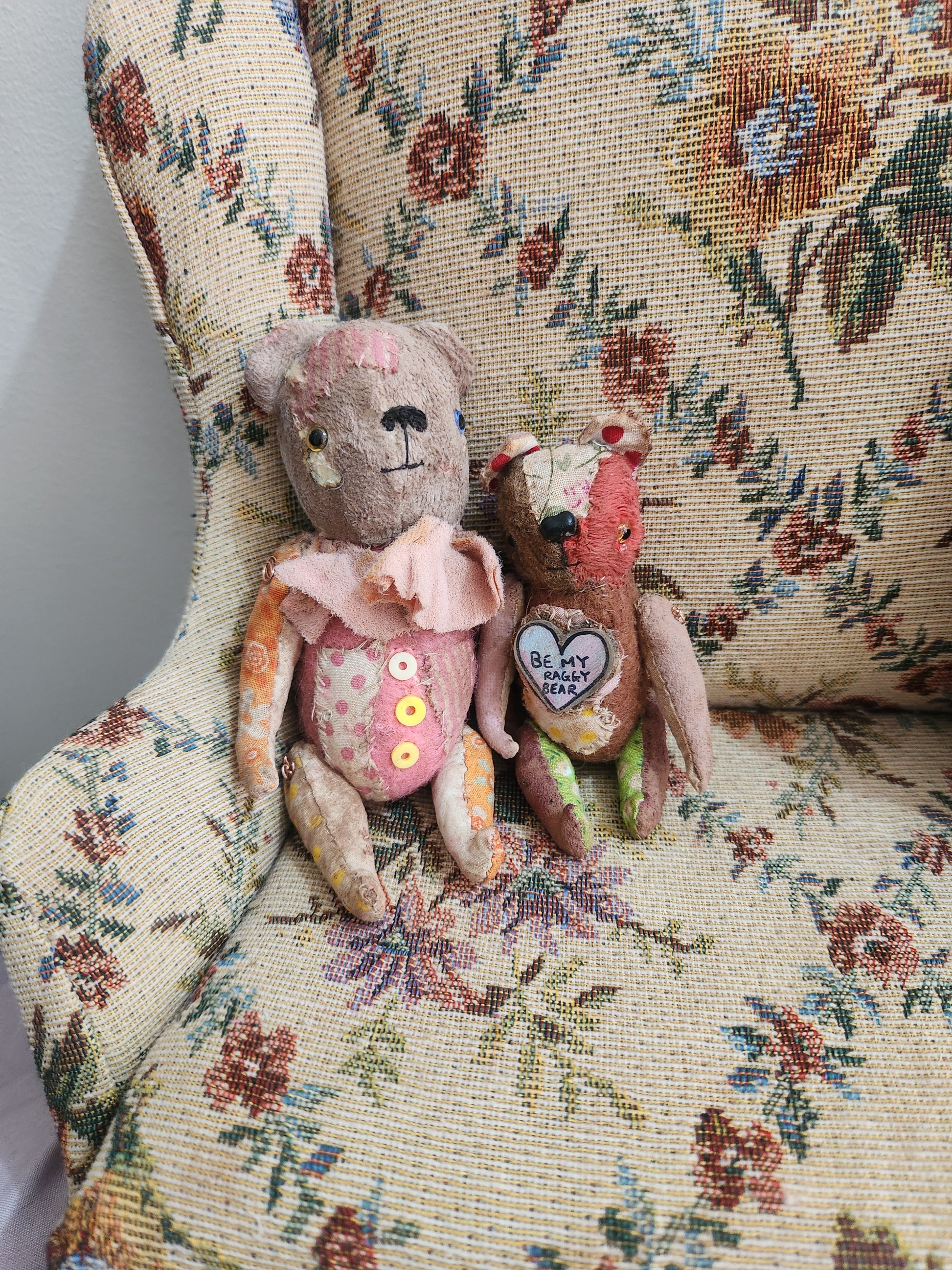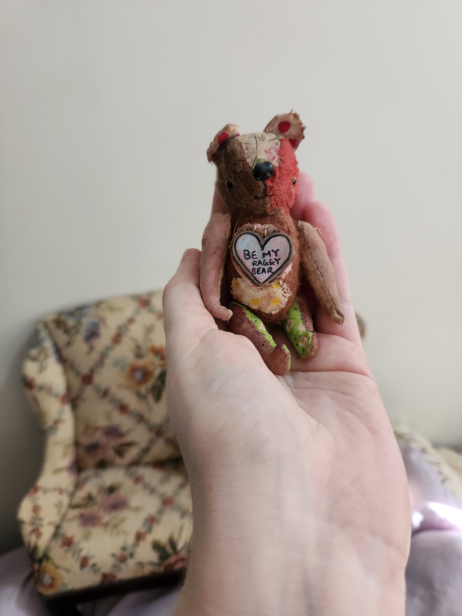 My Raggies are crafted from miniature bear fabrics, vintage fabrics and upcycled materials, including vintage and antique pieces from broken toys and dolls, as well as clothes made by me and repurposed miniature bear clothes.