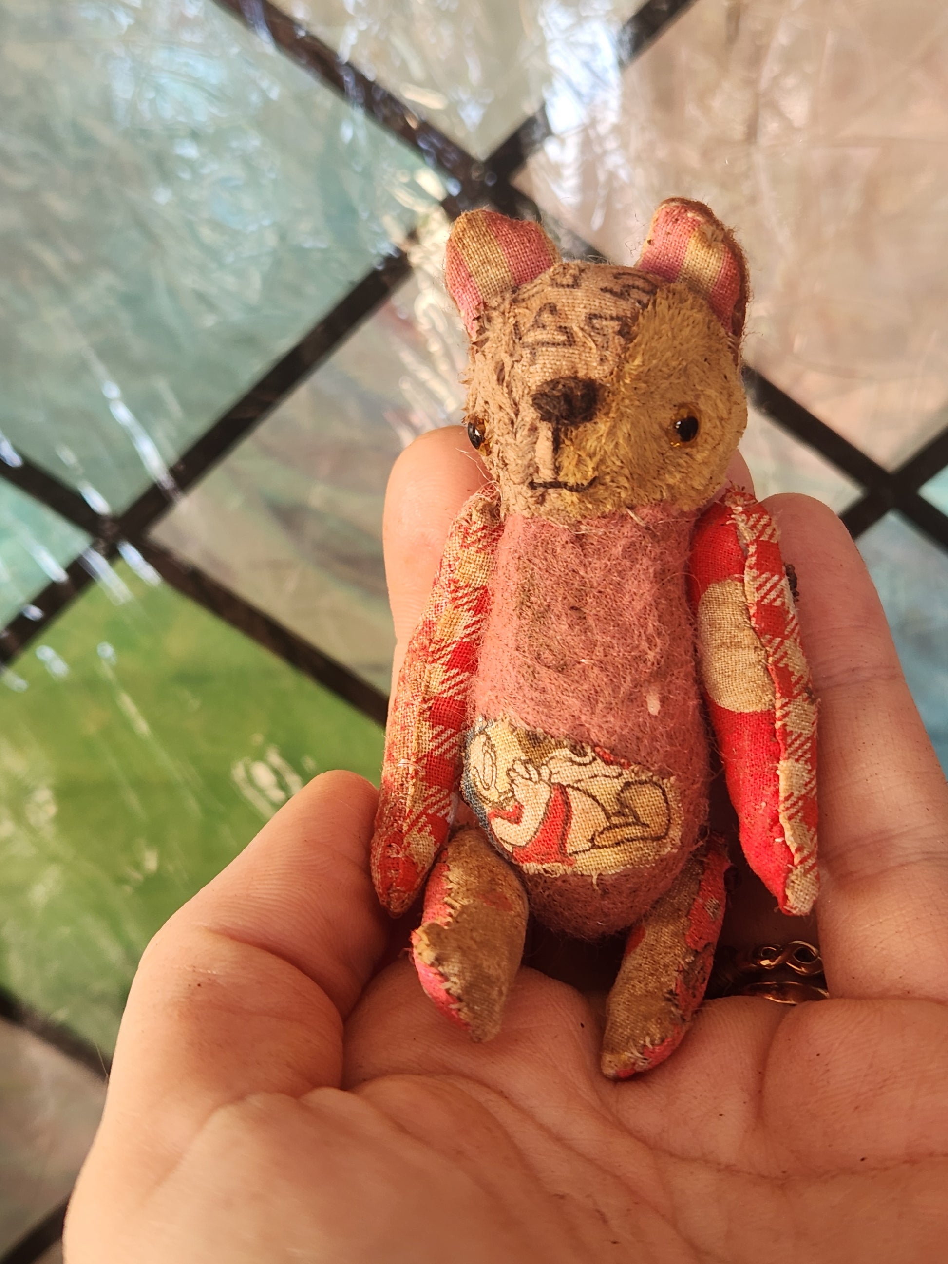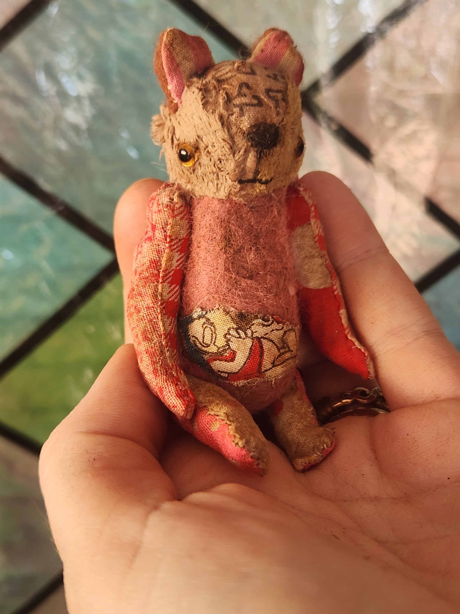My Raggies are crafted from miniature bear fabrics, vintage fabrics and upcycled materials, sometimes including vintage and antique pieces from broken toys and dolls, as well as clothes made by me and repurposed miniature bear clothes.