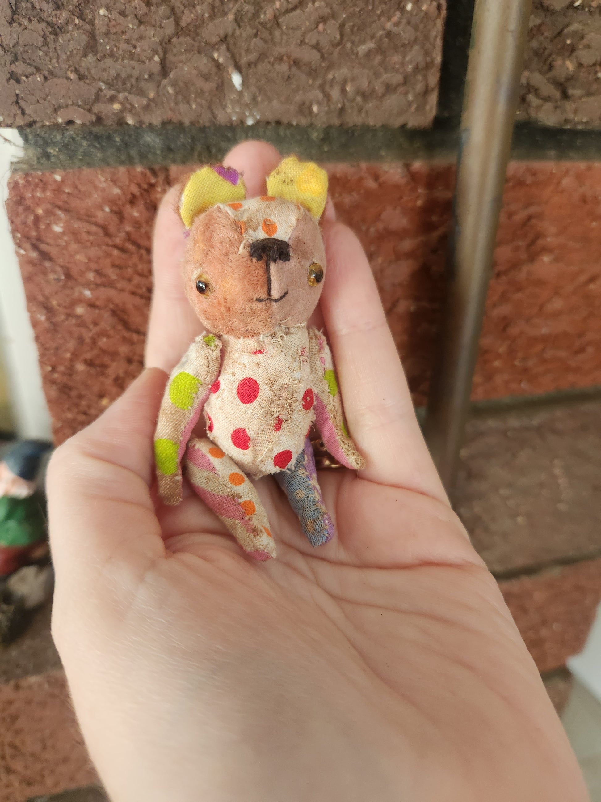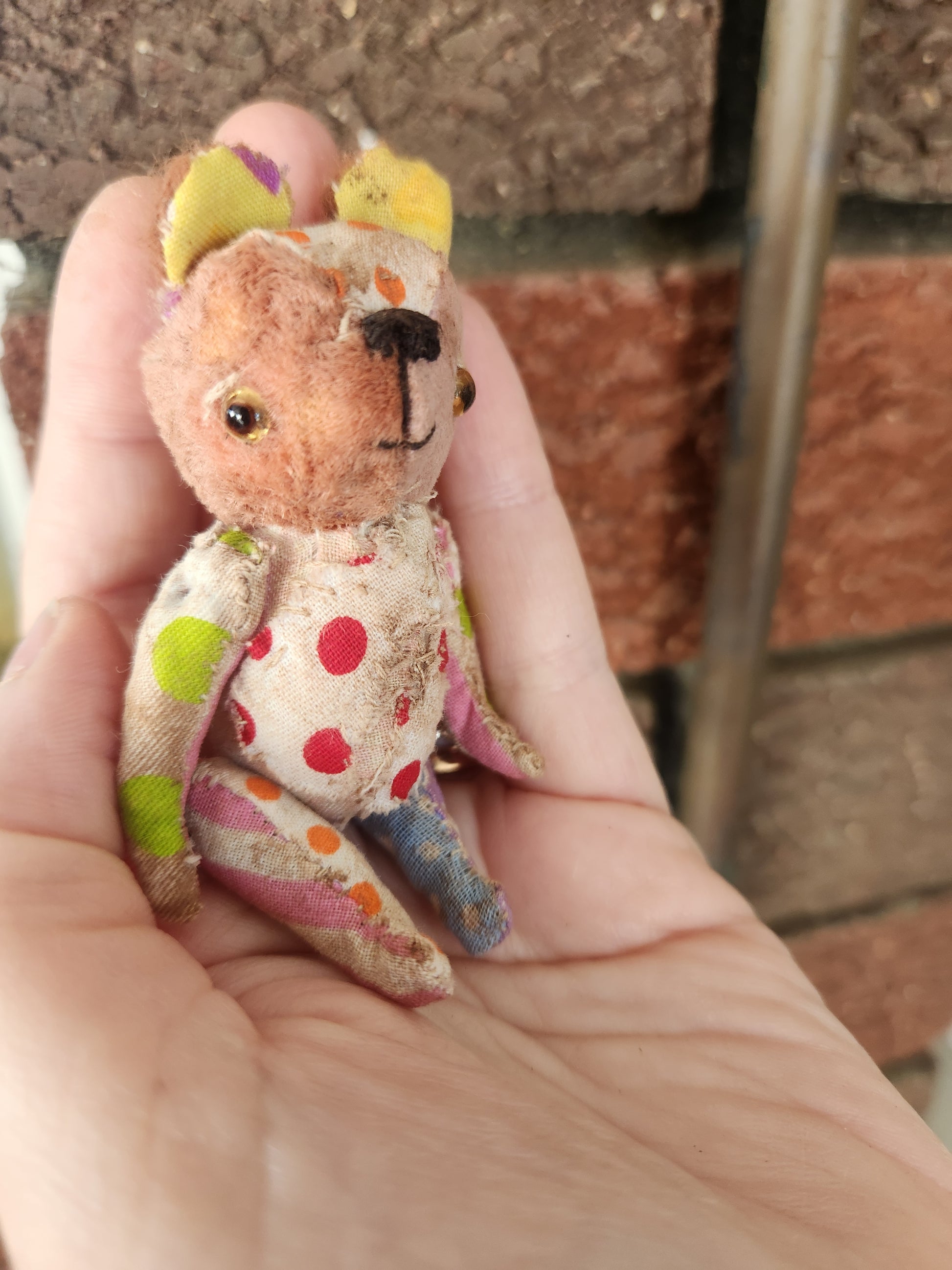 My Raggies are crafted from miniature bear fabrics, vintage fabrics and upcycled materials, sometimes including vintage and antique pieces from broken toys and dolls, as well as clothes made by me and repurposed miniature bear clothes.
