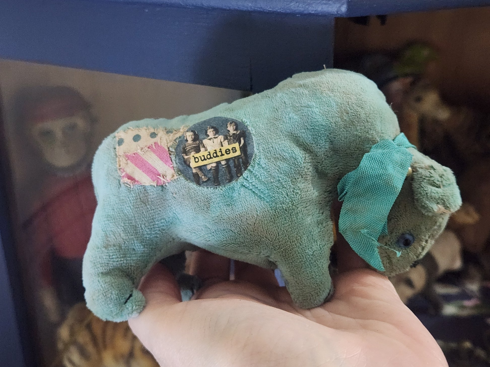 My Raggies are crafted from miniature bear fabrics, vintage fabrics and upcycled materials, sometimes including vintage and antique pieces from broken toys and dolls, as well as clothes made by me and repurposed miniature bear clothes.