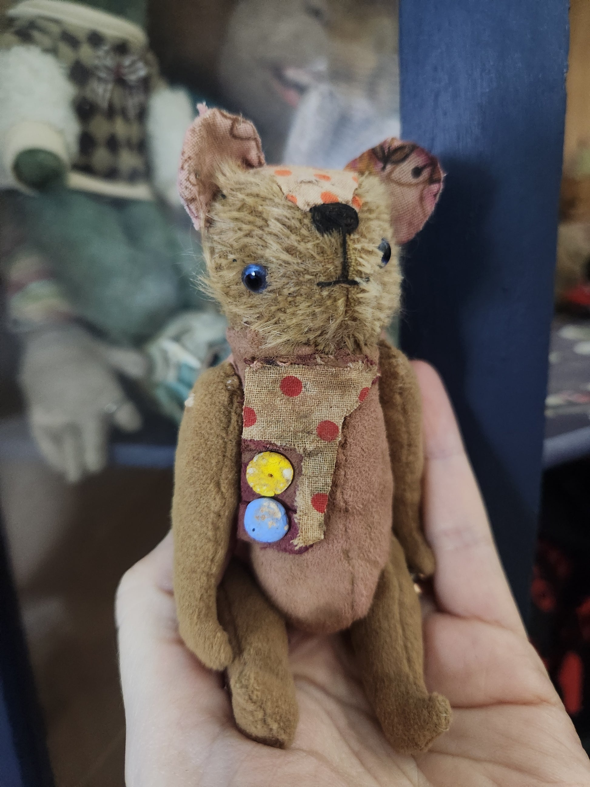 My Raggies are crafted from miniature bear fabrics, vintage fabrics and upcycled materials, sometimes including vintage and antique pieces from broken toys and dolls, as well as clothes made by me and repurposed miniature bear clothes.