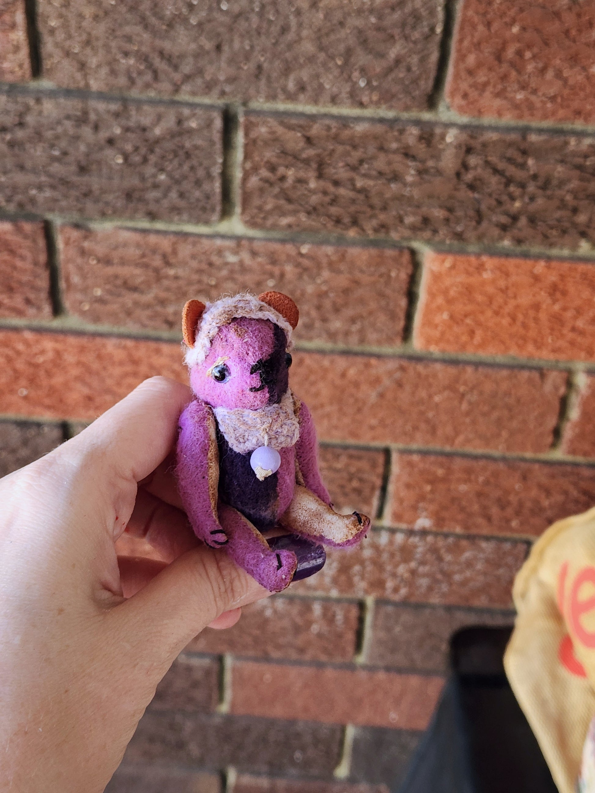 My Raggies are crafted from miniature bear fabrics, vintage fabrics and upcycled materials, sometimes including vintage and antique pieces from broken toys and dolls, as well as clothes made by me and repurposed miniature bear clothes.