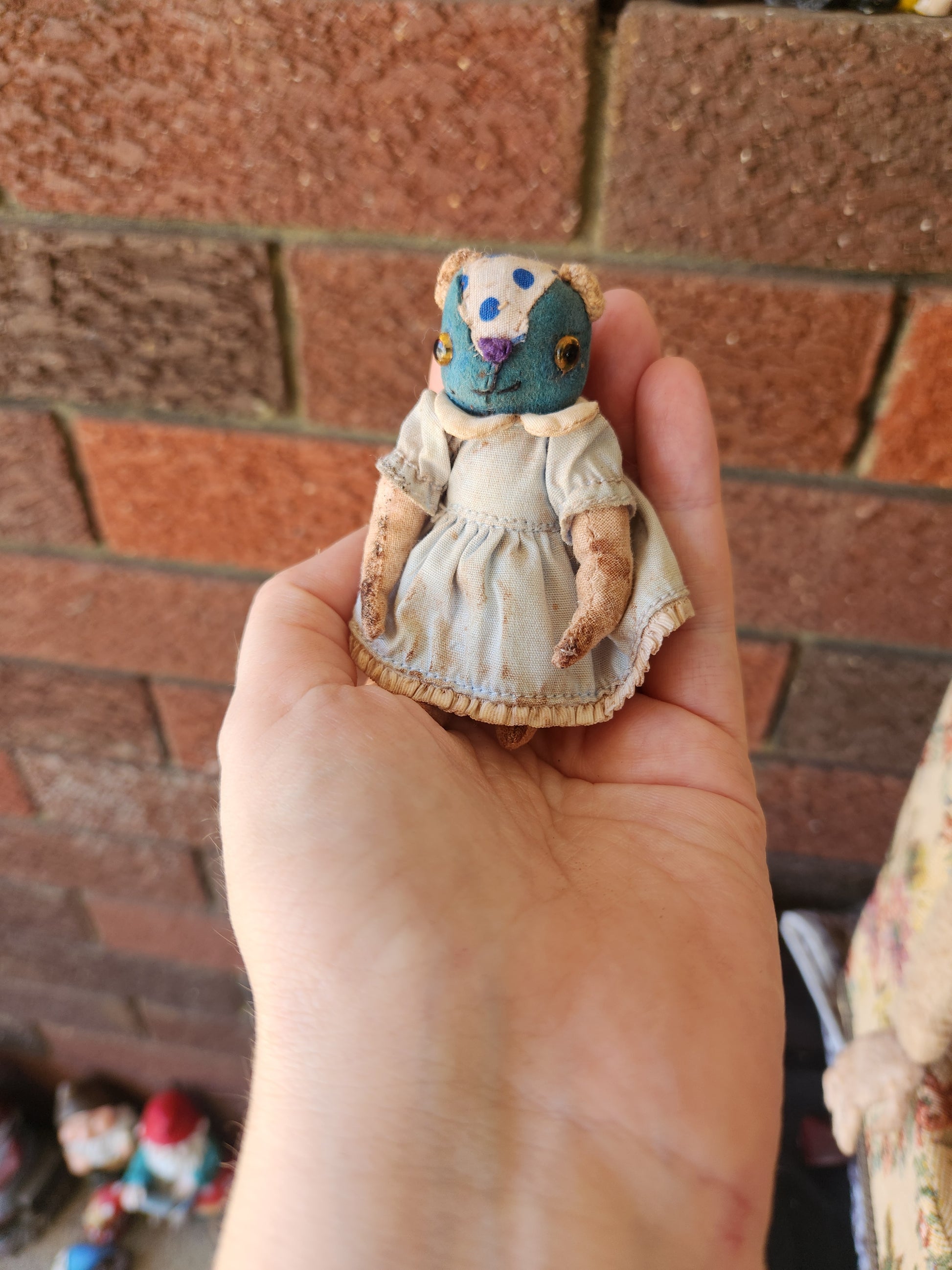 My Raggies are crafted from miniature bear fabrics, vintage fabrics and upcycled materials, sometimes including vintage and antique pieces from broken toys and dolls, as well as clothes made by me and repurposed miniature bear clothes.
