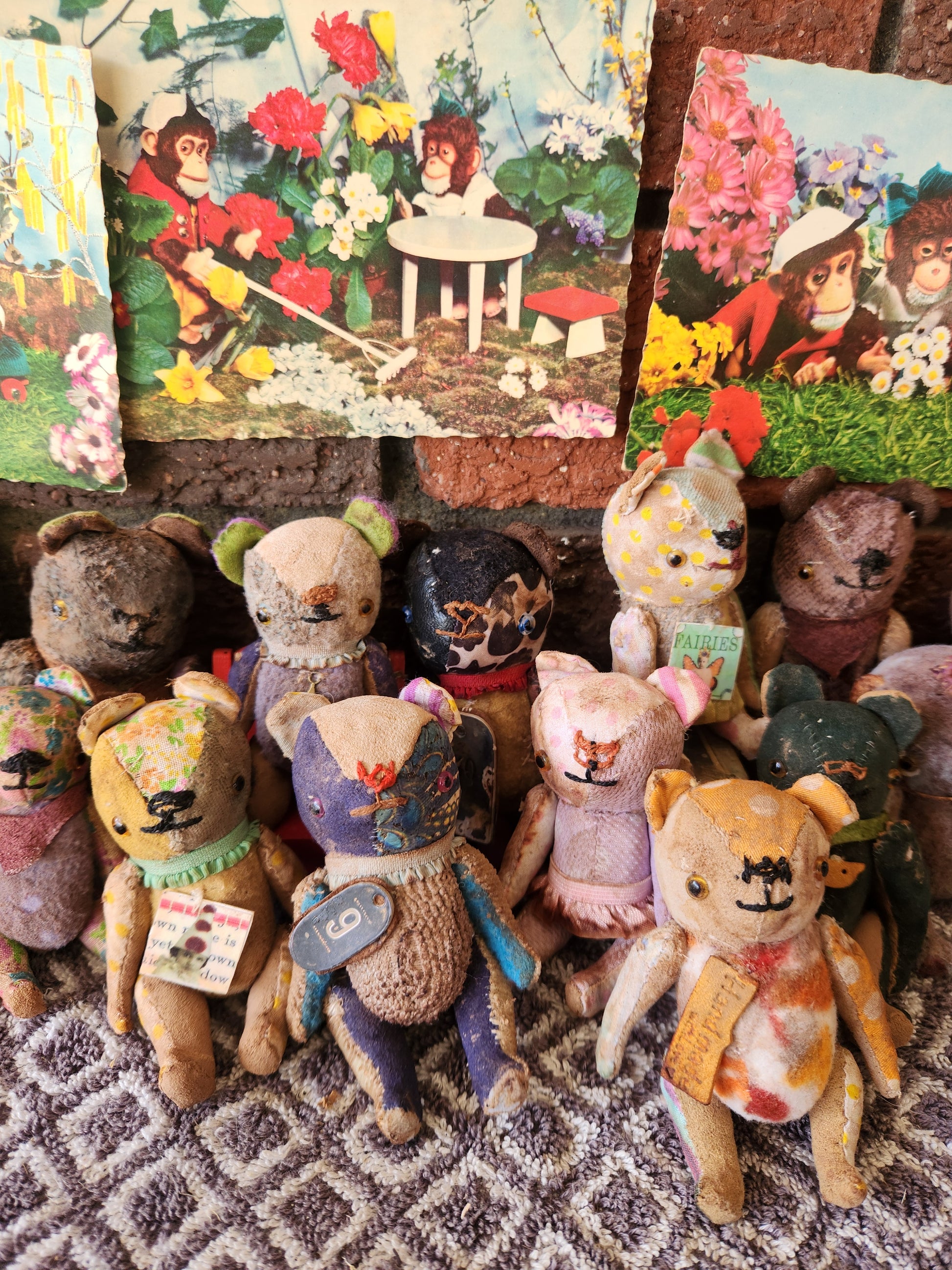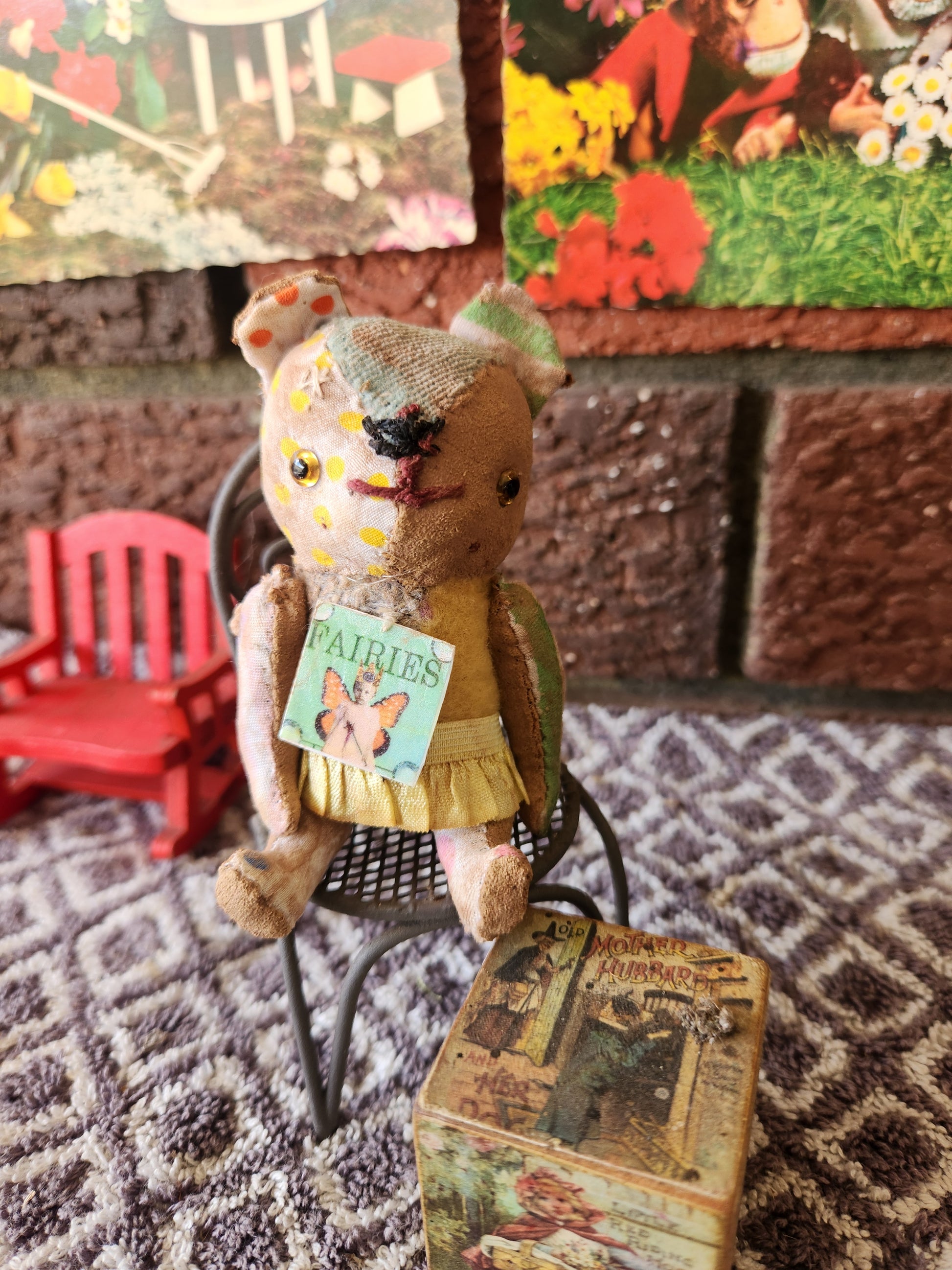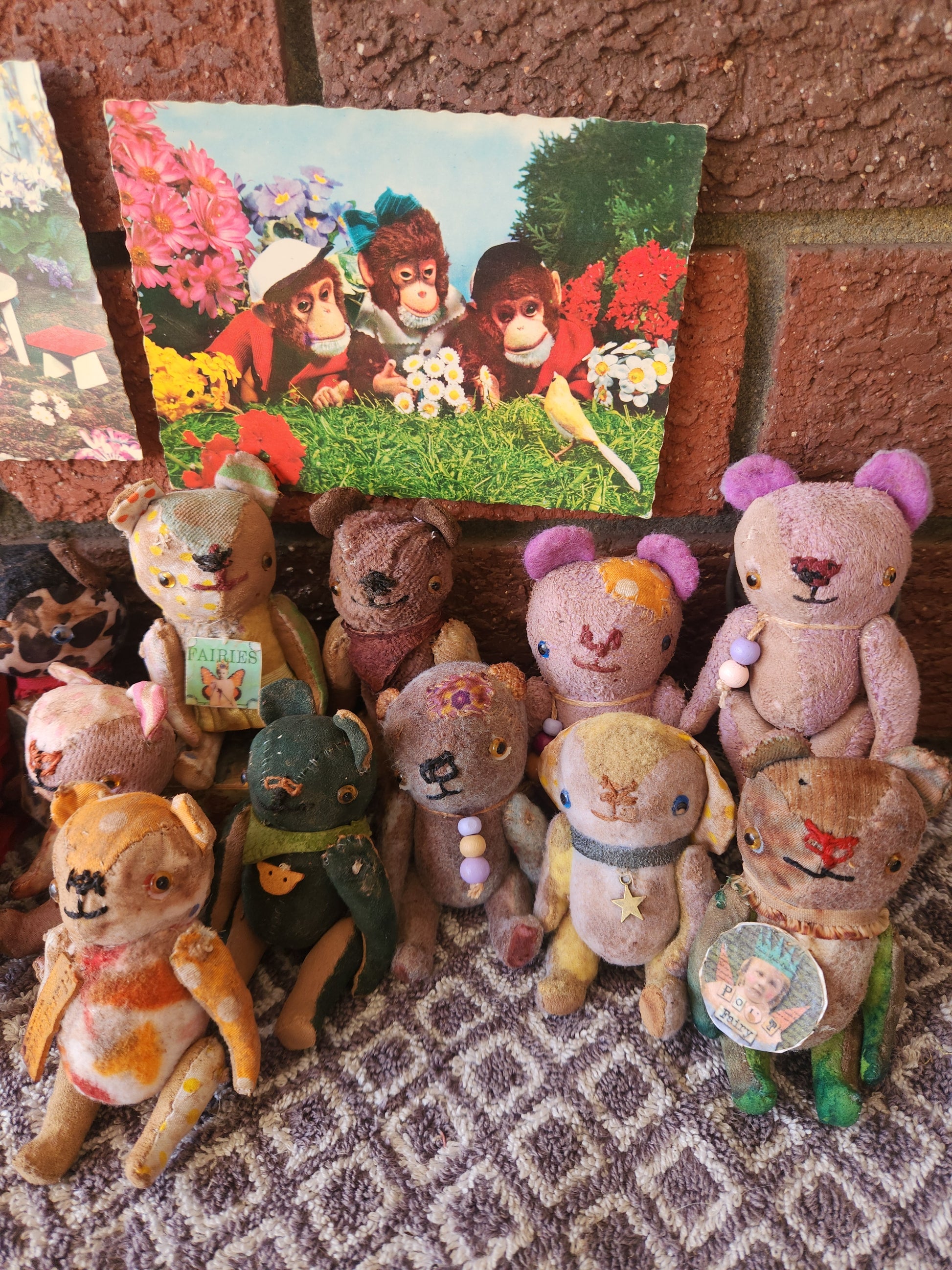 My Raggies are crafted from miniature bear fabrics, vintage fabrics and upcycled materials, sometimes including vintage and antique pieces from broken toys and dolls, as well as clothes made by me and repurposed miniature bear clothes.