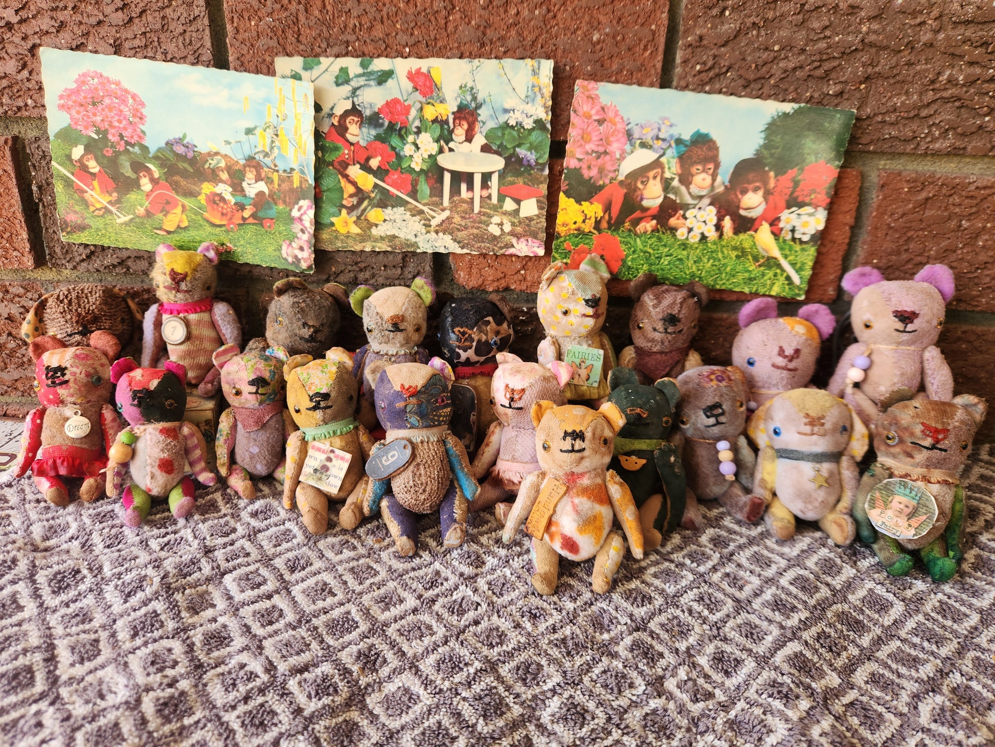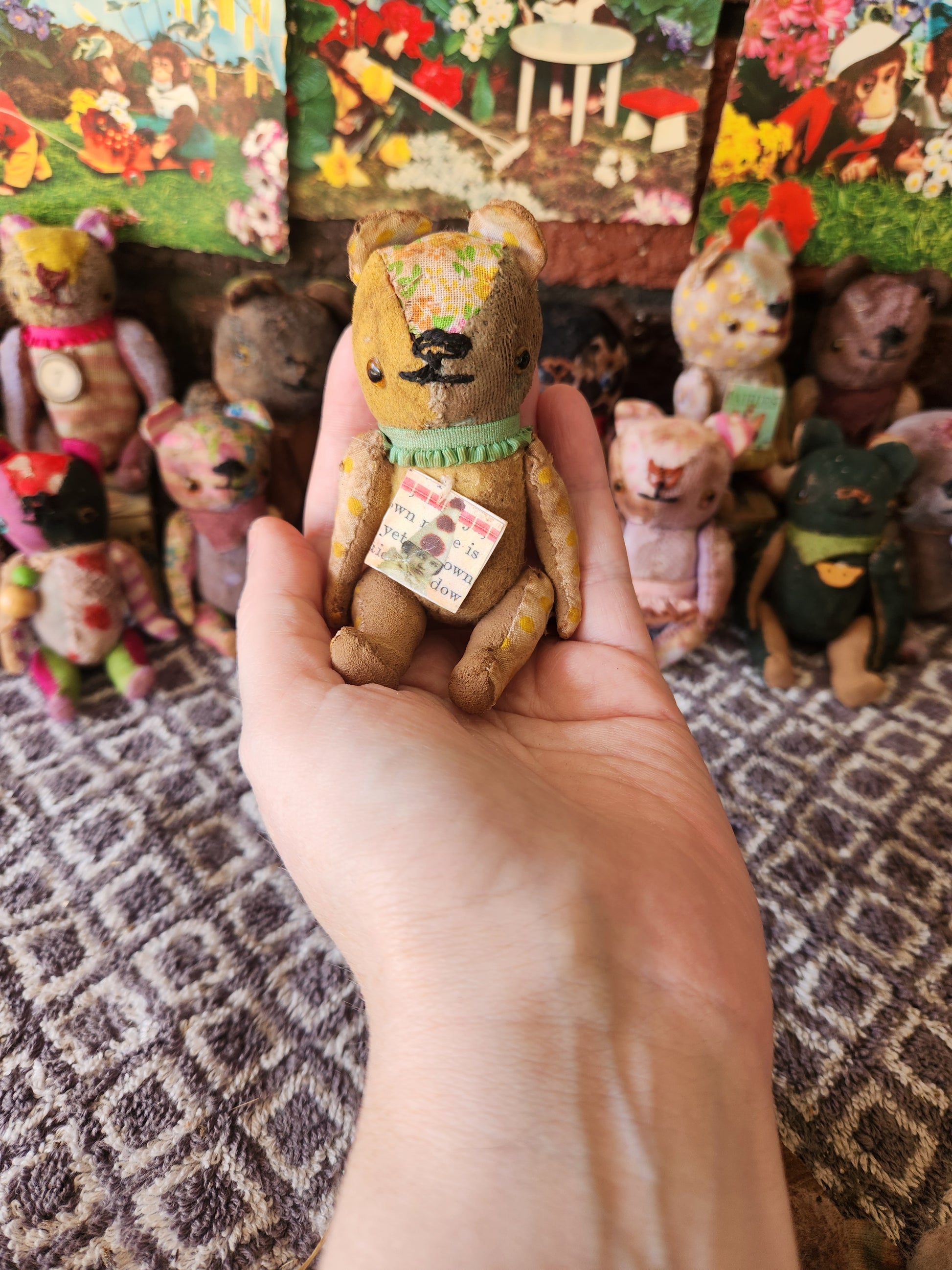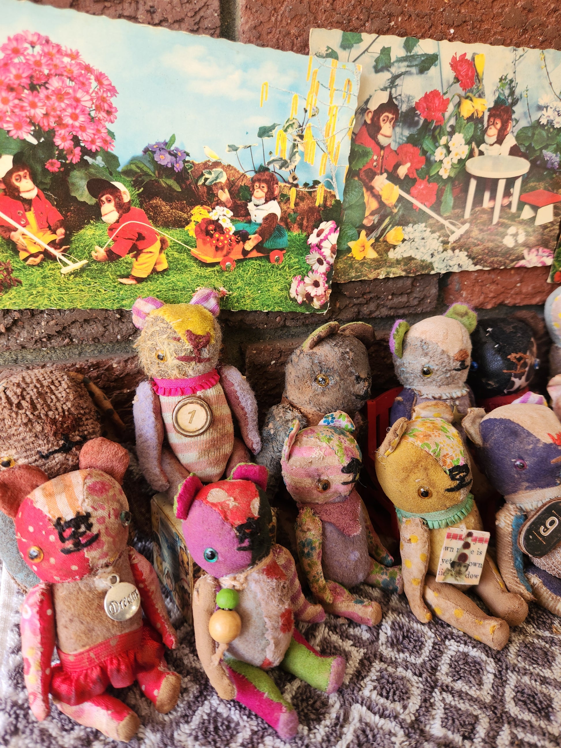 My Raggies are crafted from miniature bear fabrics, vintage fabrics and upcycled materials, sometimes including vintage and antique pieces from broken toys and dolls, as well as clothes made by me and repurposed miniature bear clothes.