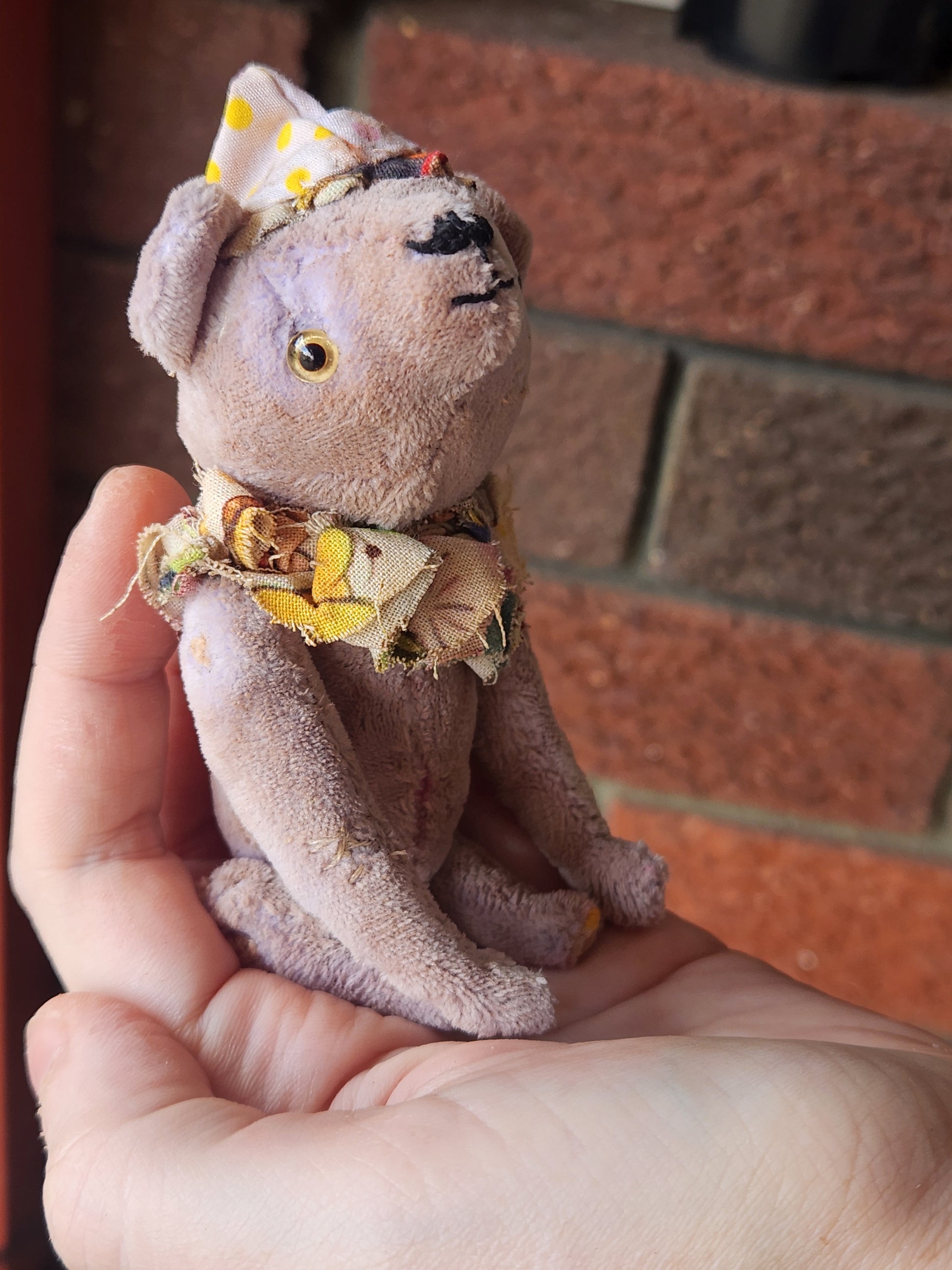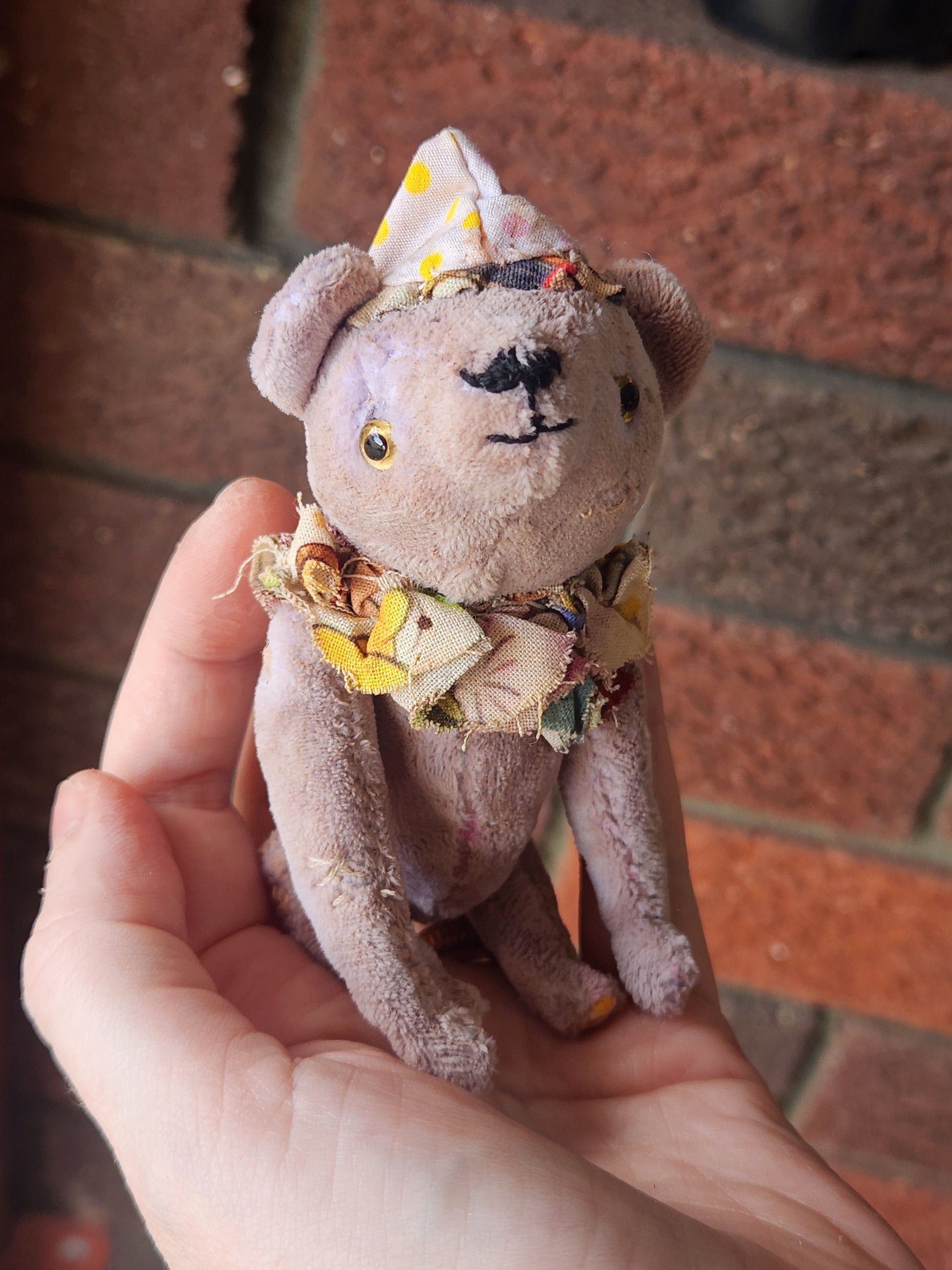 My Raggies are crafted from miniature bear fabrics, vintage fabrics and upcycled materials, sometimes including vintage and antique pieces from broken toys and dolls, as well as clothes made by me and repurposed miniature bear clothes.