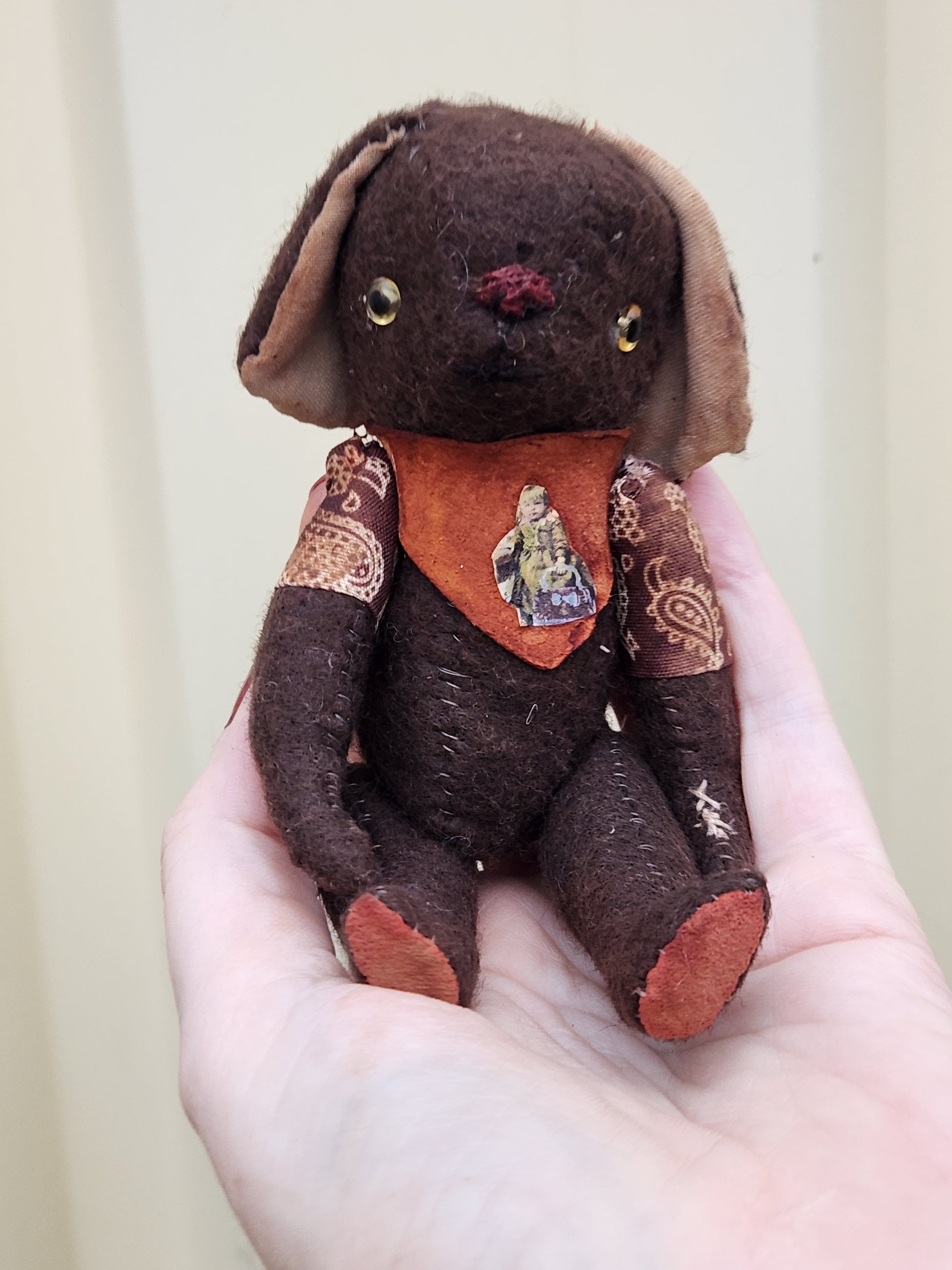 My Raggies are crafted from miniature bear fabrics, vintage fabrics and upcycled materials, sometimes including vintage and antique pieces from broken toys and dolls, as well as clothes made by me and repurposed miniature bear clothes.