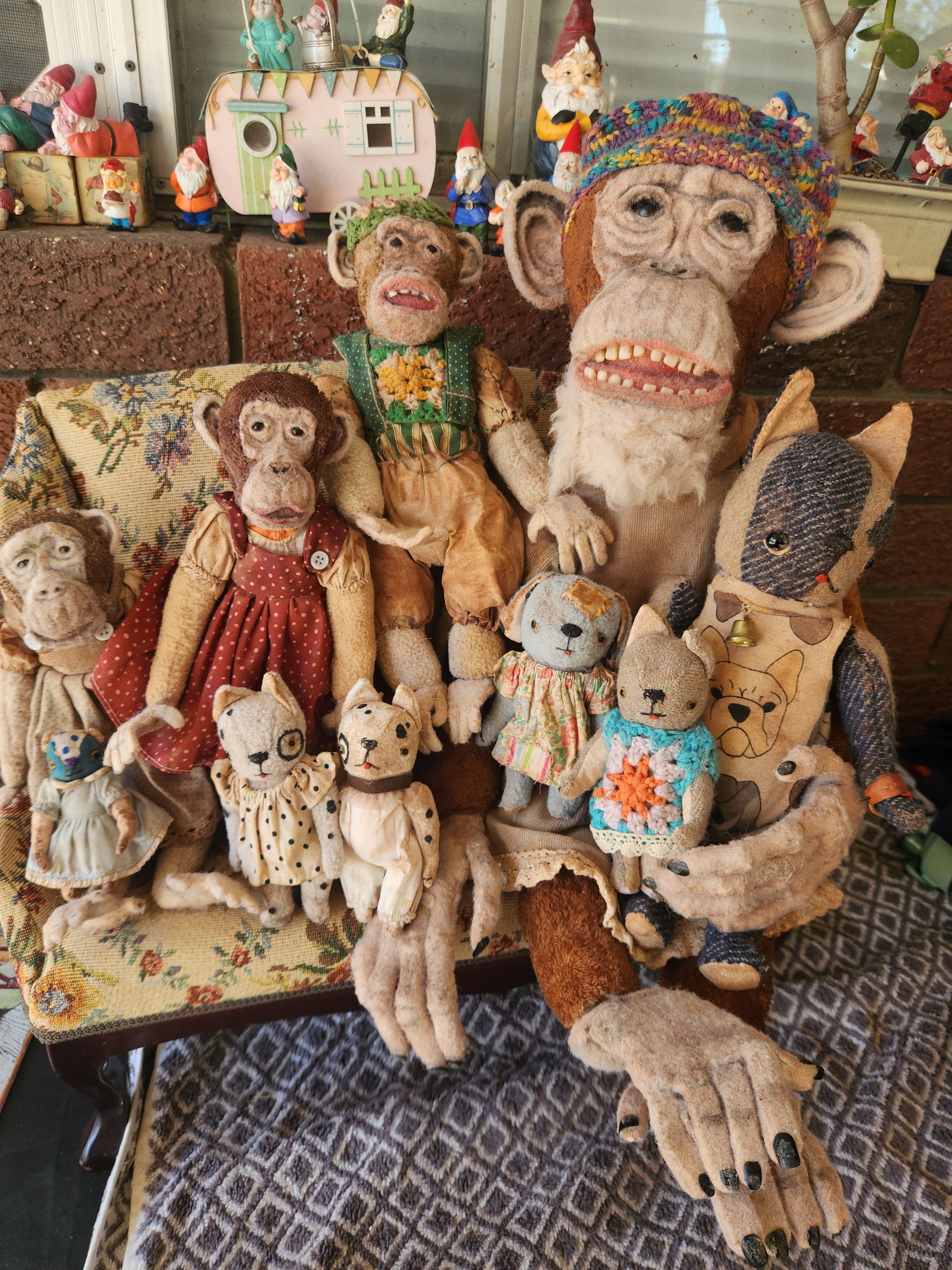 My Raggies are crafted from miniature bear fabrics, vintage fabrics and upcycled materials, sometimes including vintage and antique pieces from broken toys and dolls, as well as clothes made by me and repurposed miniature bear clothes.